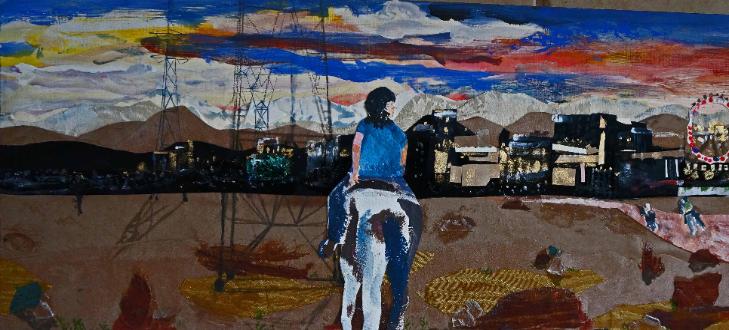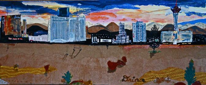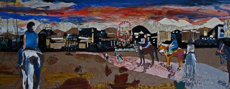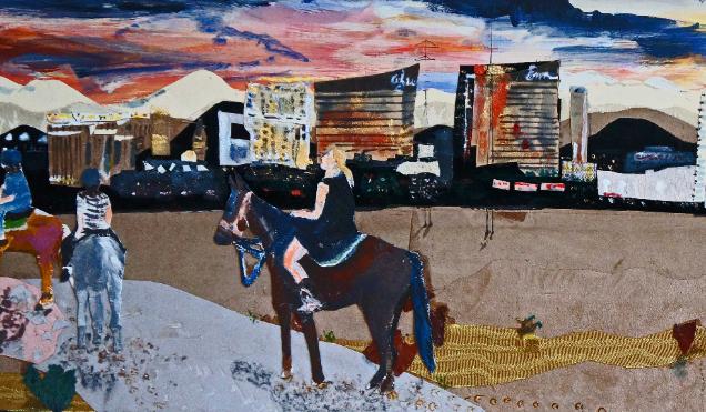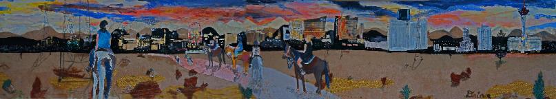 | Horseback View Of Vegas Embellished Fabric Collage 10" X 60" The mixed media is embellished fabric collage consisting of: acrylic, dimensional, various fabric, metal, and glitter paints; Swarovski crystals and studs; selenite (local stone); various leatherette, brocade, and other fabric; sealed to Masonite board with dry Steam-a-Seam glue; 300 pound paper for horses and riders; palm tree frond; and ink. |