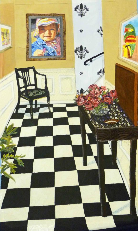 | Inspired by S. Rios and Mia 40" X 22" Embellished Fabric Collage Susan Rios is a wonderful watermedia artist. I composed the interior similar to one of hers, but this interior medium is rich in silk and tapestry fabrics. The subtle designs in each piece of fabric, cut and placed, is seen only when viewing the original closely. The paintings on the "walls" are of Mia, my granddaughter when she was 2 years old , and two other watermedias of mine. |