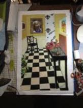| Inspired by S. Rios and Livy 40" X 22" Embellished Fabric Collage on Giclee This interior started three years later as the giclee of the Mia picture on left, then embellished differently also using silk, tapestry, and other fabrics. The paintings on these "walls" are of Livy, my second grandchild, and two other more abstract collages. |