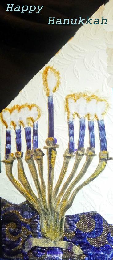 "Happy Hanukkah" is also embellished fabric collage on 100% cotton matboard, with gold leafing,