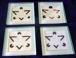 | Kanizsa triangles 4" X 4"- Four (3/8") thick glass fabric collage Kanizsa triangle coasters- Sold in LasVegas,NV |