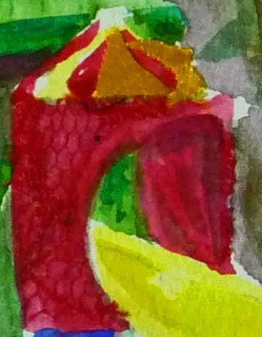 See detail below of red net fabric embellishing watercolor.