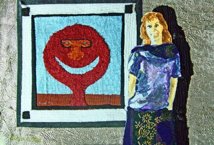 The watercolor of the figure (me) is embellished with fabric from sari material scraps from an