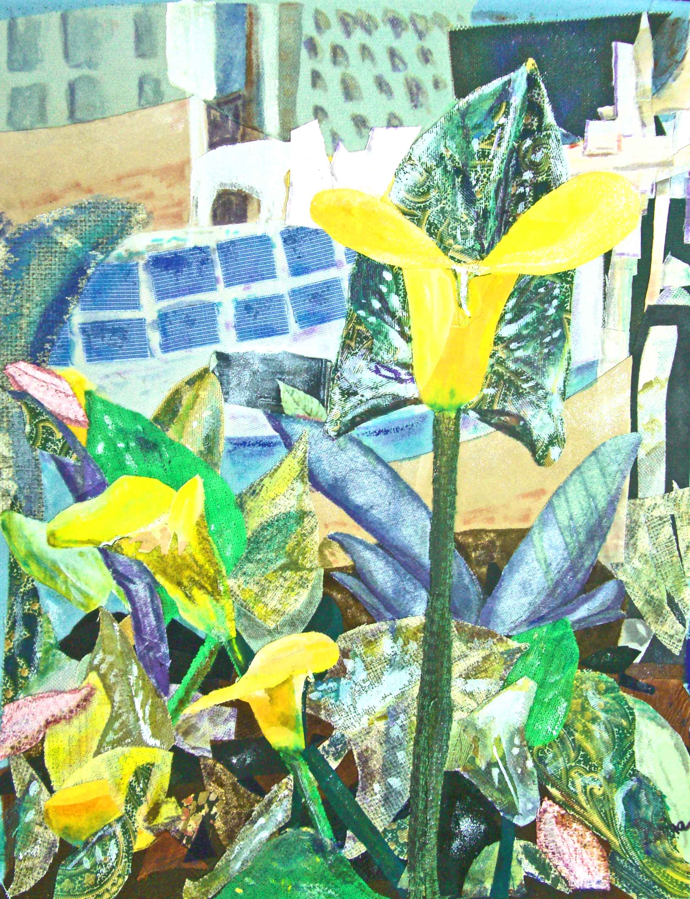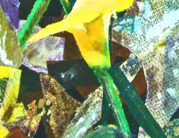 20" X 16" Embellished Fabric Collage At the request of a school colleague who liked calla lilies, I made my first calla lily embellished fabric collage. I'd seen only white calla lilies, so when I saw this patch of yellow lilies in a garden in California, I was inspired to recreate it in fabric and acrylic paint.